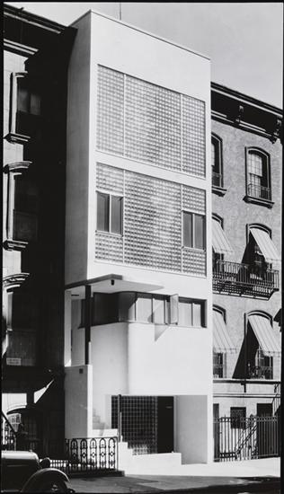 [Back exterior view of the Lescaze home, 211 East 48th Street.]