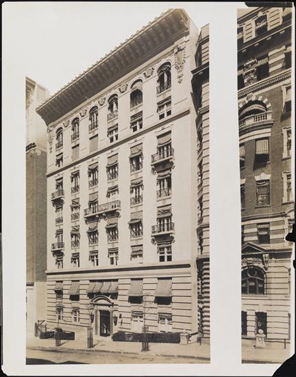 98th Street at the S.E. corner of West End Avenue. Apartment house.