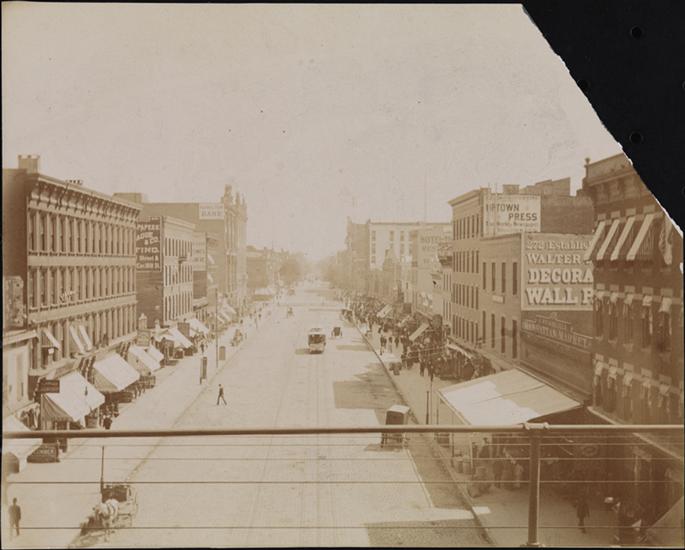 [Looking northwest on 125th Street at Amsterdam Avenue.]