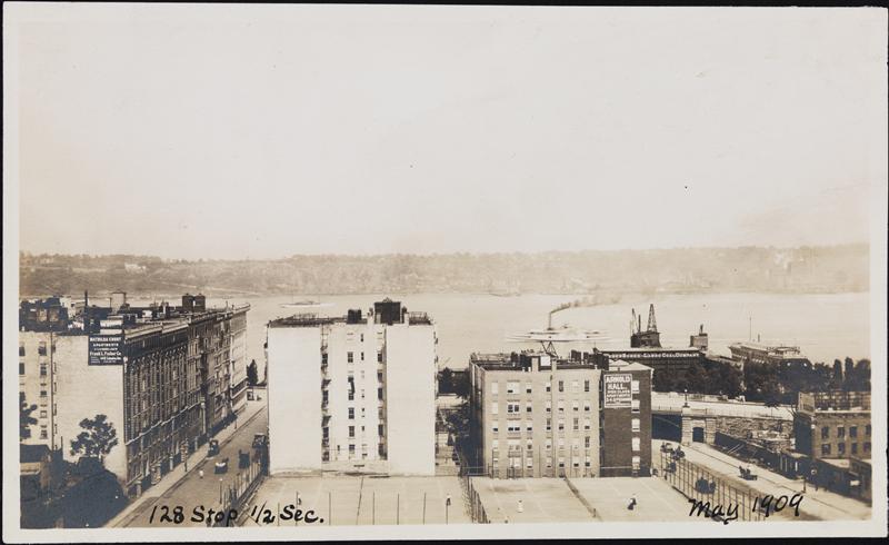 [Aerial view of the World Trade Center looking toward the Hudson River.]