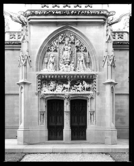 Woodlawn [Cemetery], O.H.P. Belmont mausoleum, detail carved head over entrance.