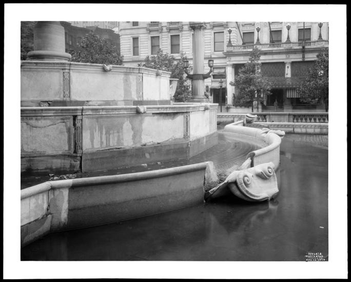 5th Avenue between 58th and 59th Streets. Pulitzer Fountain, deteriorated Kentucky limestone.