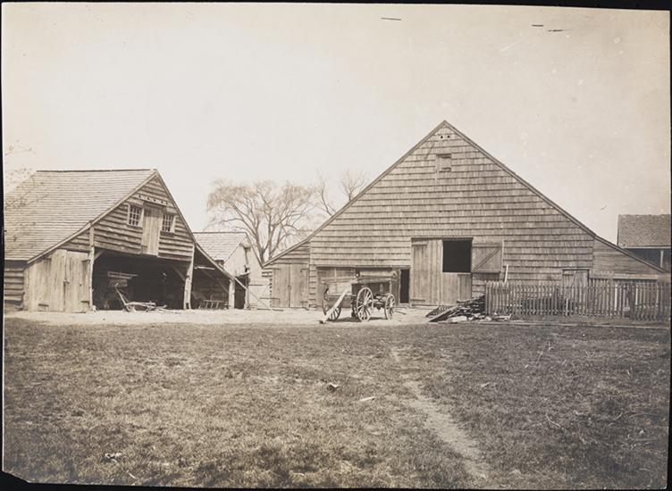 Charles G. Meyer [residence]. Gray barn thru trees.