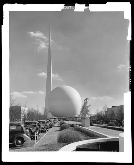 New York Worlds Fair. Theme center, "Astronomer" sculpture [Showing the Perisphere.]