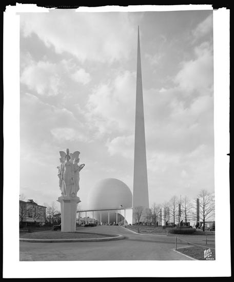 New York Worlds Fair. Theme Center [Trylon and Perisphere], "Four Victories of Peace" statue