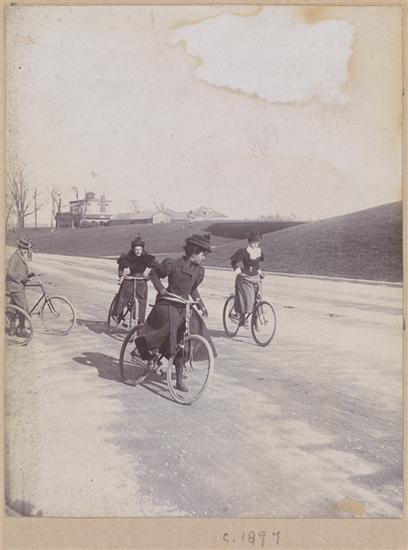 [Mrs. F. M. Cossitt, first woman to ride a bicycle in New York.]