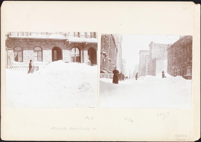 [Two views of snowy residential streets.]