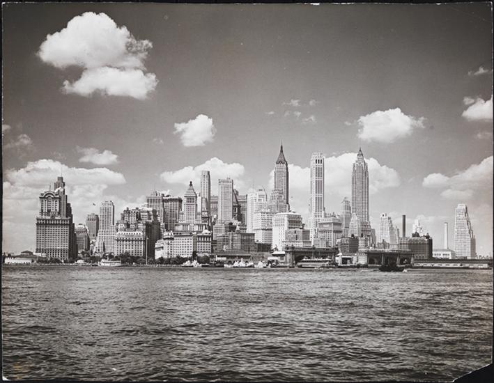 [View of Lower Manhattan skyline from the South Street Seaport.]