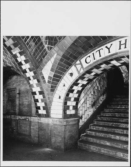 [Arch and stairway from train platform at the City Hall Station.]