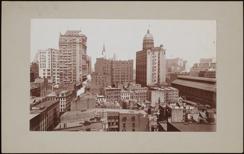 In pencil, on verso: Bridge Entrance / Rear of Tribune & World Bldg / Emigrant Savings Bank.