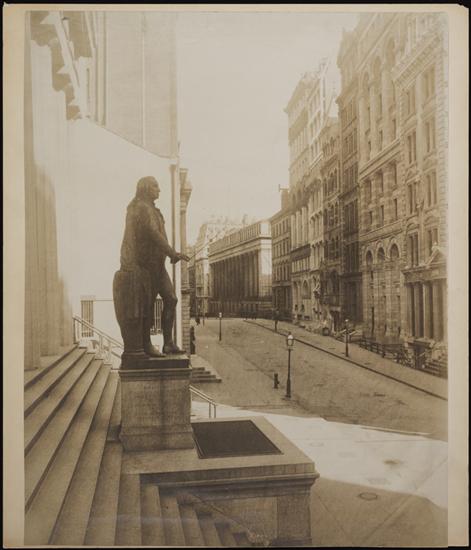 [Statue of George Washington by John Quincy Adams Ward, above the steps of the Federal Hall National Memorial.]