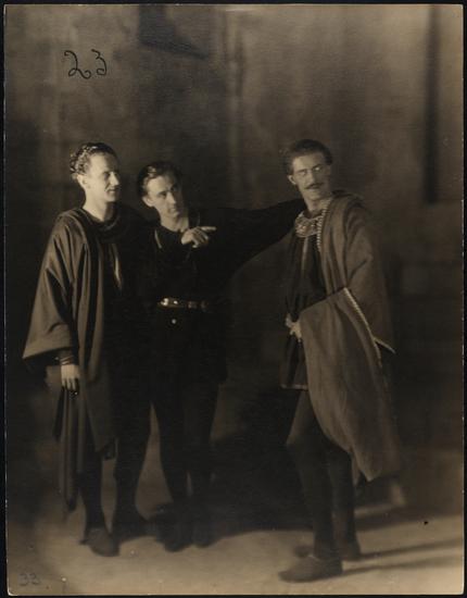 [Frederick Lewis as Horatio, John Barrymore in the title role, and E. J. Ballantine as Marcellus in "Hamlet".]