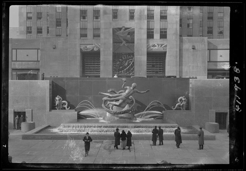 [Rockefeller Plaza. Two men in front of the Prometheus fountain in Rockefeller Center.]