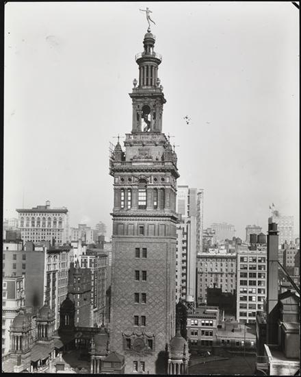 [Detail of Madison Square Garden's Tower with the scuplture of Diana and surrounding rooftops.]