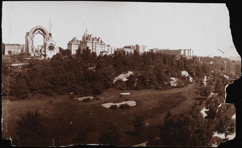 Morningside Park showing Arch of New Cathedral and St. Lukes Hospital, New York.