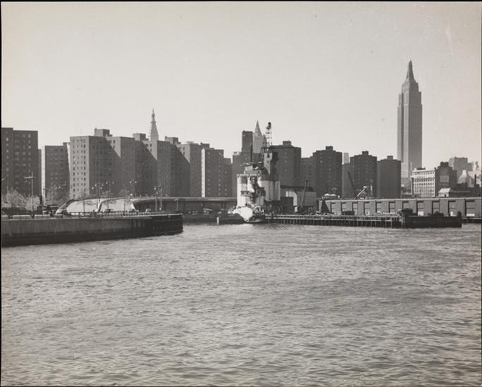 [Looking northeast over the East River beyond the approach to the Manhattan Bridge to the Empire State Building.]
