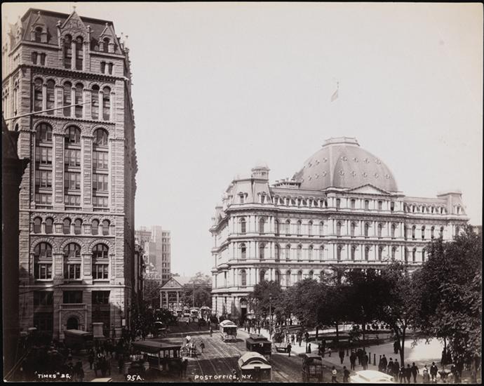 Broadway and City Hall Park showing Post Office and Park Row Building.