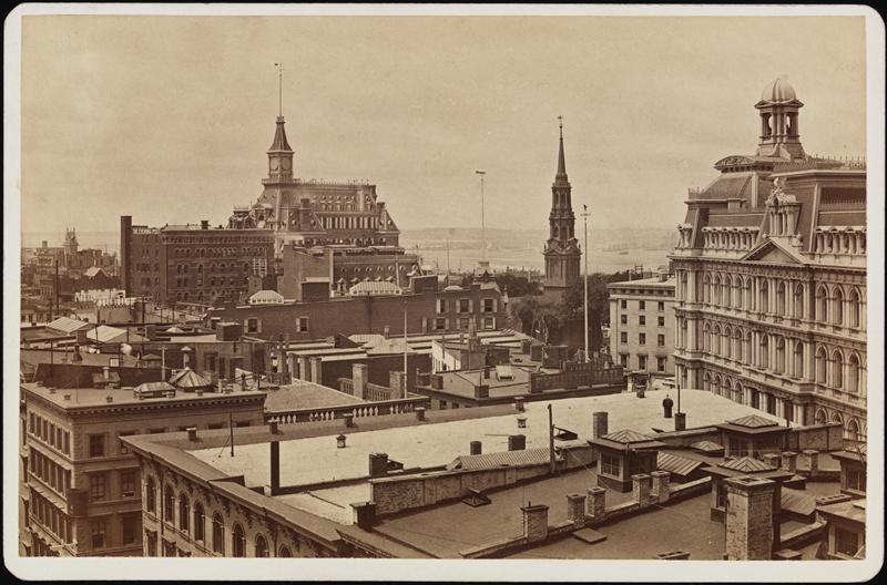 Broadway Series. Looking north from 2nd floor window at corner of Fulton Street. St. Paul's portico at left. Post office at right.