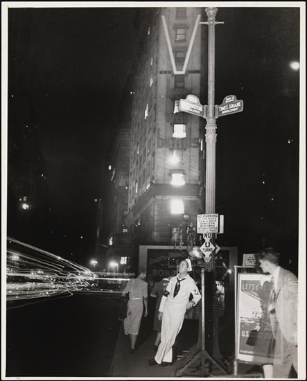 Identification Duffy Square [Sailor and civilian in Times Square.]