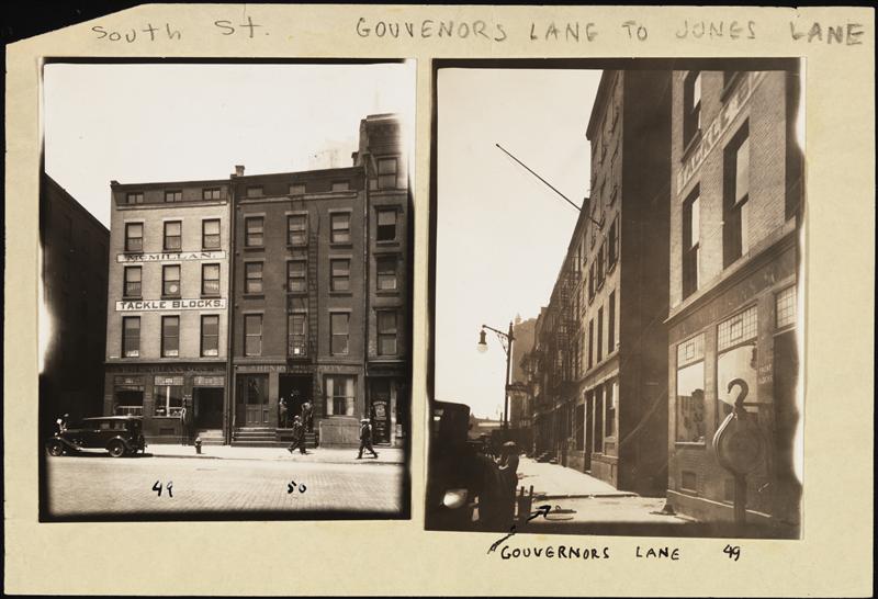 [Two views of # 76-77 South Street, looking south on South Street just above Maiden Lane.]
