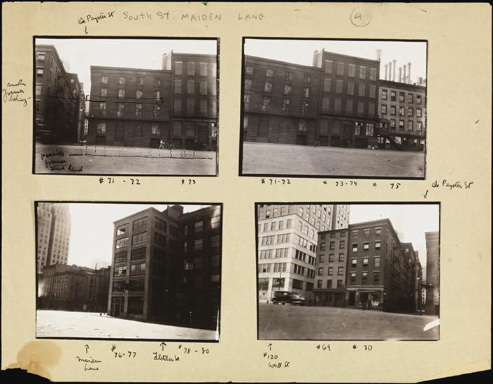 [Two views of # 76-77 South Street, looking south on South Street just above Maiden Lane.]