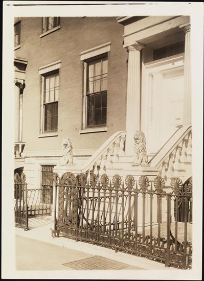 [Balcony at window on Washington Square North at corner of 5th Avenue.]