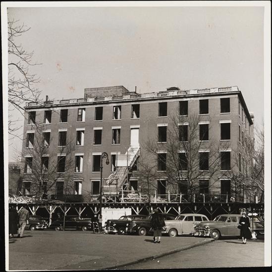 [Balcony at window on Washington Square North at corner of 5th Avenue.]