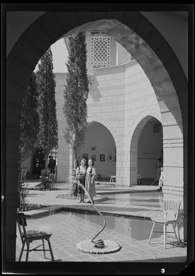 New York Worlds Fair, Sweden, two girls in costume and fountain.