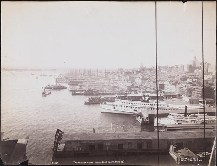 [New York & Bay from center of Brooklyn Bridge.]