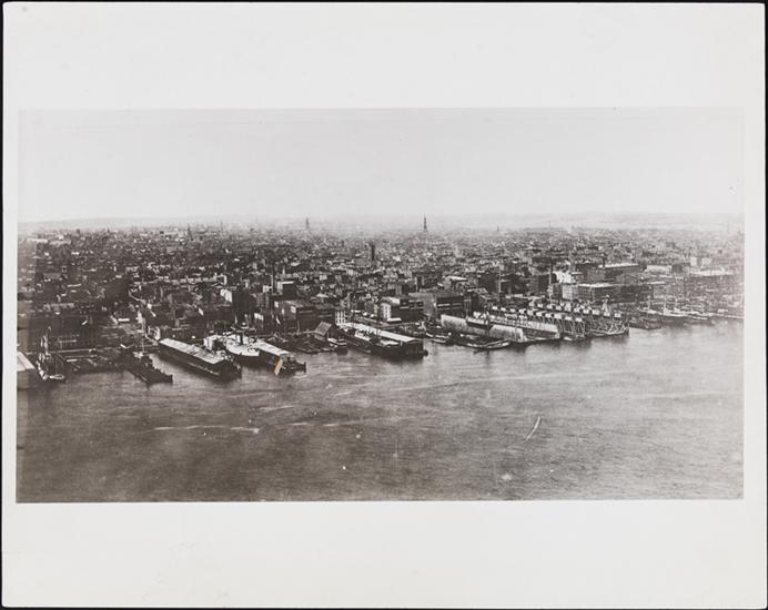 New York City views. [Manhattan] skyline and [East] river from Warner Quinlan's dock, Long Island City, [Queens].