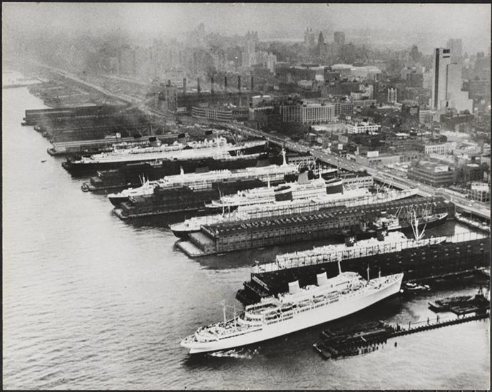 [Ocean liners tied up at North River piers.]