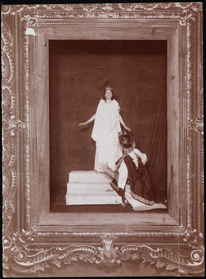 A "Living Picture:" a male and female model in costumes reminicient of ancient Greece, posing within a frame.