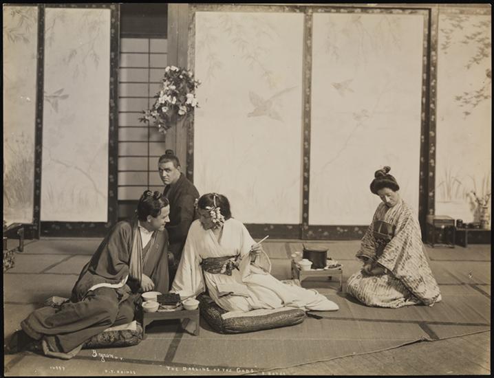 Scene from "Darling of the Gods" featuring Blanche Bates, George Arliss and Robert Haines.