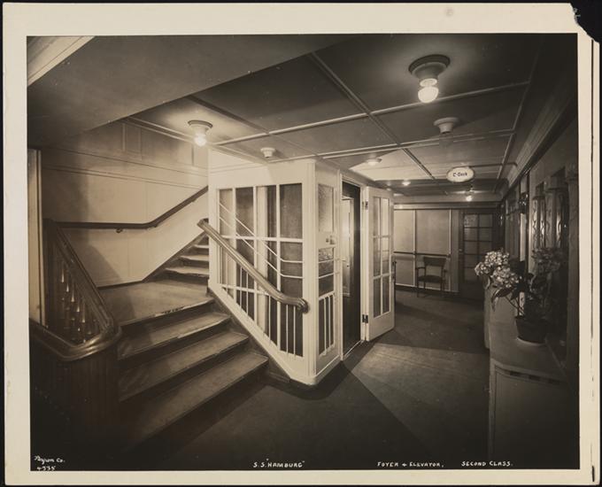 United American Lines, S.S. "Hamburg", Pier 86 North River, Second Class Interior, Foyer & Elevator.