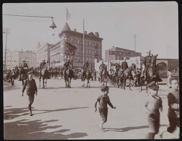 Police Parade, June 1, 1897/ Scene on E. 29th St. Man Marching West Toward Fifth Ave. Passing Aside Calumet Club.