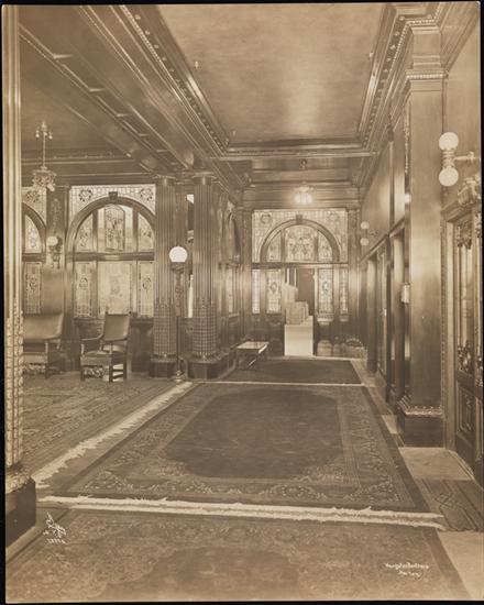 A showroom at Weingarten Brothers, makers of corsets. Stained glass, floor lamps, wall sconces, rugs, chairs, columns, chandeliers, a couch, a doorway and rugs are visible.