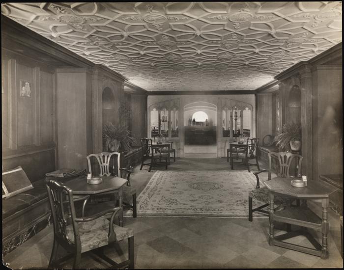 Interior, Carved Wood Chairs and Fern Pedestal, United Novelty Works.