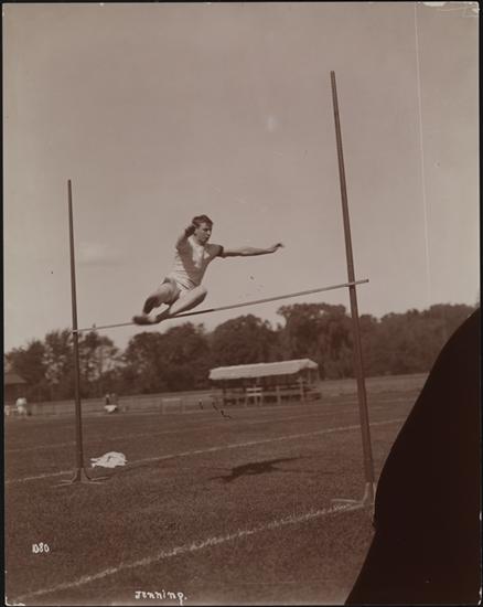 A track and field athlete doing the high jump at the Oxford and Cambridge training session at the Berkeley Oval, New York.