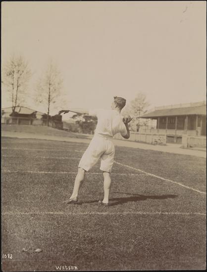 A track and field athlete shot-putting at the Oxford and Cambridge training session at the Berkeley Oval, New York.
