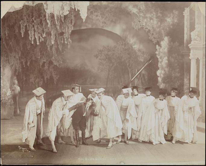 A scene from Owen Hall and Leslie Stuart's musical "The Silver Slipper" presented by John C. Fisher at the Broadway Theatre in 1902 featuring Sam Bernard as Henry Bismark Henschs.