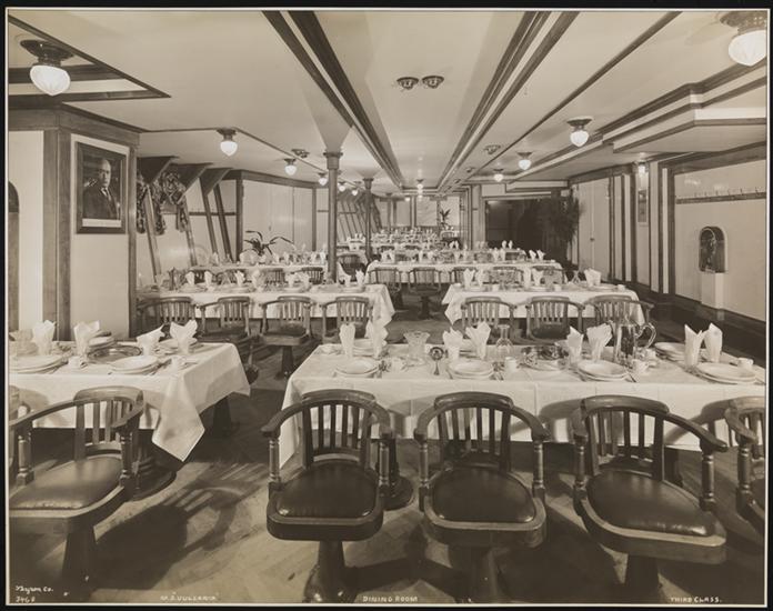 United American Lines, S.S. "New York", Pier 84 North River, Interior, Dining Room, Third Class.