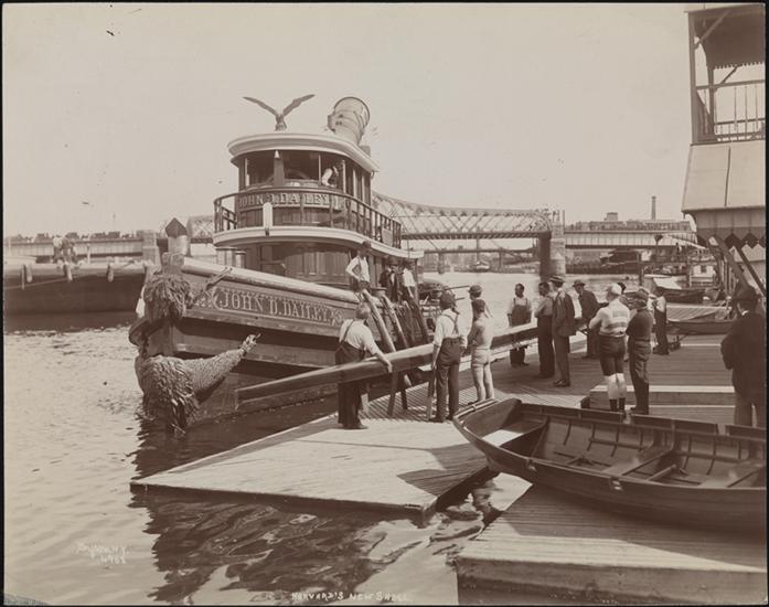 Men with Harvard's new rowing shell on a pier of the Harlem River.