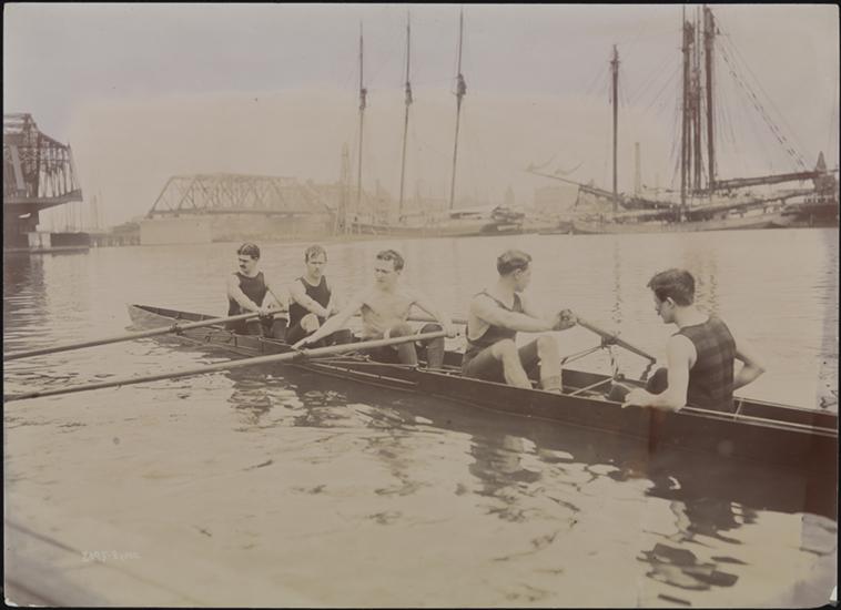 Four rowers and coxswain in their rowing shell on the Harlem River.