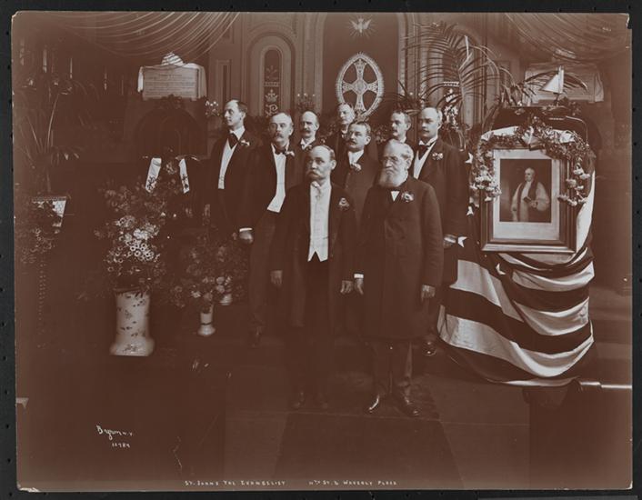 Nine men standing posed at the altar decorated with flowers and a portrait.