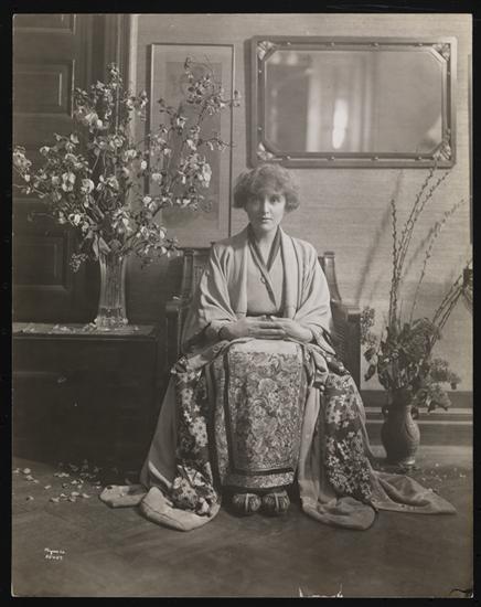 Description Florence Reed dressed in an ornate Japanese tea kimono, sitting in the parlor of her residence.