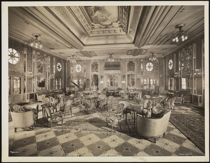 Italia-America Shipping Corp., S.S. "Roma", Pier 97 North River, Interior, First Class, Lounge, Looking Aft.