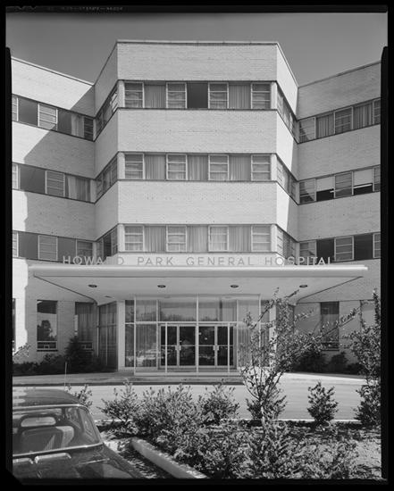 Ocean Avenue and Shore Parkway. Coney Island Hospital, exterior, detail of main entrance of portico.