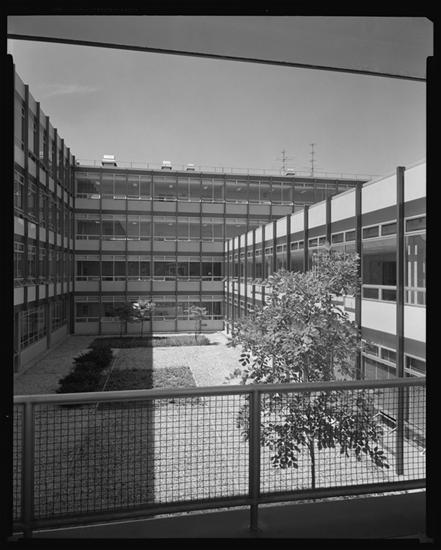 Kissena Boulevard. Queens College, Academic Building No. 1 Social Science Building, view looking S.E. along breezeway toward dome, theater, and lecture hall.
