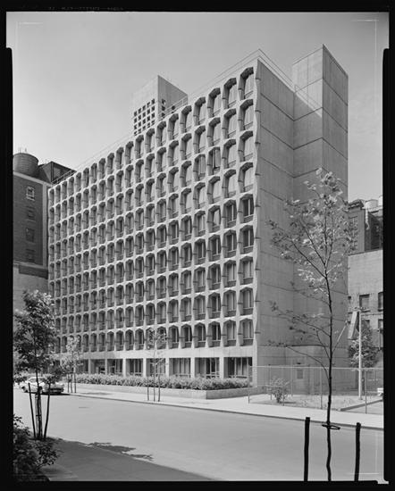West 27th Street between 7th and 8th Avenue. Fashion Institute of Technology, Nagler Hall dormitory, view of front from N.E.