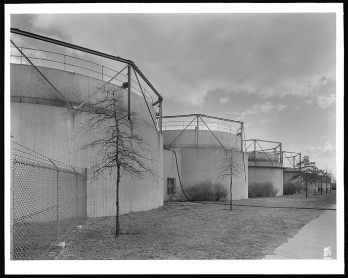 Sewage disposal plant, Idlewild International Airport, birds-eye view of disintegrating tanks, looking S.W. at closed tanks